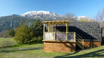Het knusse houten interieur van 15m² staat garant voor gezellige, intieme avonden. Vanuit het overdekte terras van 9m² heeft u een mooi uitzicht over de bergen.